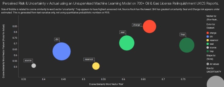 The chart above shows vector cosine similarity between various play elements and the ‘risk’ word vector on the x -axis, and ‘failure’ (proxy ‘actual’ i.e. for dry hole/eq.) word vector on the y-axis. The size of the bubble is the similarity to the ‘uncertainty’ word vector.