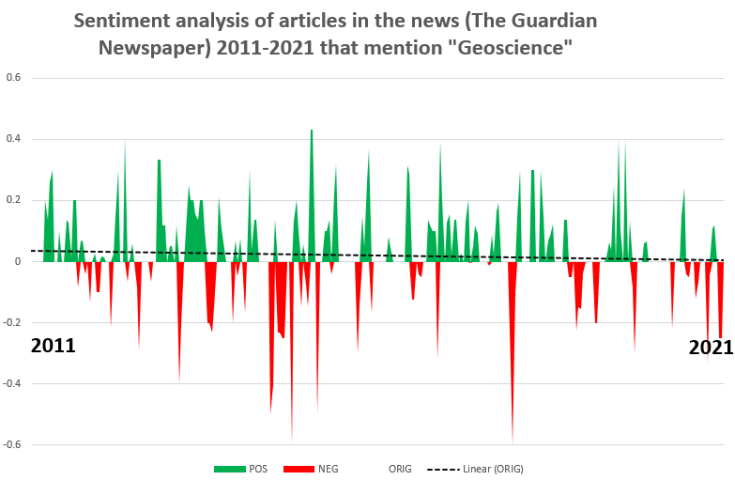 Sentiment analysis of the last ten years of Guardian news articles mentioning geoscience. Geoscience is often mentioned in context to natural geohazards. However, there might be a trend towards increasing negative sentiment over time that may warrant further exploration.
