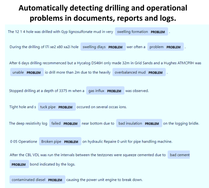 Using machine learning to detect mentions of drilling and operational problems in text. Over 5,000 public domain sentences have been labelled to train a predictive machine learning model to detect wellbore drilling and operational ‘problems’ (including reservoir and production) in documents, reports and logs.