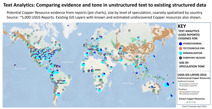 Over 5,000 USGS reports were analysed using Natural Language Processing (NLP) and Machine Learning to detect potential environments for Copper. Over 1.5Million detections were made. The results were coarsely spatialised by country and shown on the map above. The larger the pie-chart the greater the tone of uncertainty / speculation. These data were displayed in context to existing USGS spatial layers on known and estimated undiscovered copper resources. Given a lot more reports and more granular geo-locations, further patterns may emerge to potentially spark new questions or lines of investigation.