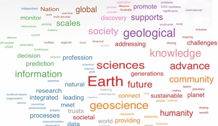 I took the mission and vision statements from geological societies and surveys at International, European and National levels then semantically clustered in a word cloud. The colours are words grouped by similarity (share similar words). A few themes emerge (my interpretation):