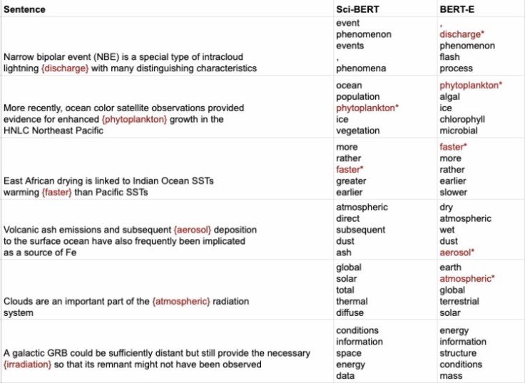 The NASA IMPACT team published a paper at AGU back in 2021 on BERT-E an Earth Science trained language model (270k articles) comparing to Sci-BERT (see screenshot). https://agu2021fallmeeting-agu.ipostersessions.com/default.aspx?s=9D-AC-B5-BA-E8-8D-CE-44-5F-17-8E-3F-B5-16-0E-60