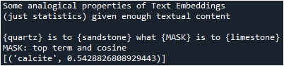 Text embeddings can capture some interesting semantic relationships. Given an analogy “Quartz is to Sandstone” what “…….. is to Limestone” – using vector additions and subtractions, latent trajectories in embedding space produce “calcite” as the answer.