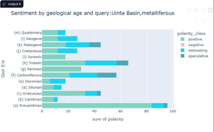I’ve been experimenting using text embeddings to generate sentiment of a corpus of documents. In this approach it is generated by geological age (but can be other contexts). Taking any input query e.g. “aquifer” then combining that (adding vectors) with geological age vectors and comparing to the cosine of the vector of various sentiment themes, then summing all the hyponym vectors to get the visual bar plot by geologial period/era. The actual sentiment vectors detected are also displayed to allow drill down to the evidence e.g.