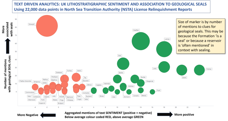 Topseal performance is critical for geological disposal sites, whether that is carbon capture & storage or radioactive storage, as well as natural hydrogen or oil & gas exploration. I’ve used patterns in text only using machine automated techniques, to visualise Lithostratigraphic Formations by their association to clues for ‘seal’ (y-axis), by the overall sentiment of the geological formation (x-axis). All these data are driven inductively by public UK North Sea Transition Authority License Relinquishment reports generating 22,000 data points.