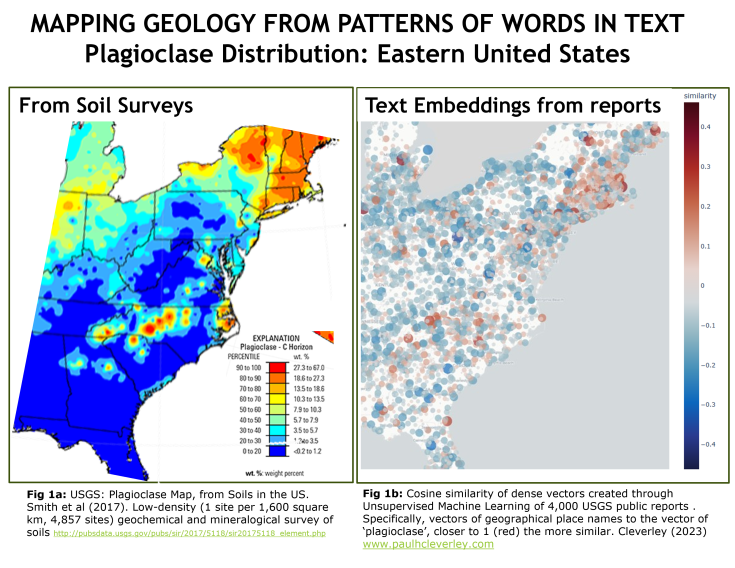 The map on the right is the vector cosine similarity between the dense vectors (text embeddings) of geographical place names to ‘plagioclase’. The closer the cosine is to 1 (reds) the ‘more similar’ the vector. The source is 4,000 public USGS reports that were used to create a text embeddings model using unsupervised machine learning. Research is ongoing as I perform more tests and collect more data.