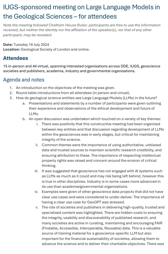 AI in Geoscience: An International Union of Geological Sciences (IUGS) sponsored meeting on Geoscience Large Language Models (LLM) took place at the Geological Society of London on July 16th attended by 59 stakeholders world-wide.