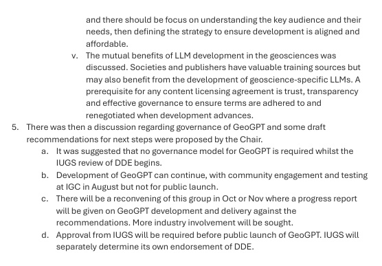 To ensure IUGS and the wider international geoscience community leads the way on open science and ethics in AI, meeting participants emphasised the desire for transparency and openness of data. Specifically, the need to publicly release, at an article (item) level, all of the geoscience data used to train DDE’s GeoGPT which is around 50Billion tokens.