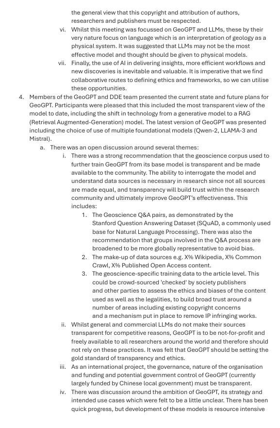 To ensure IUGS and the wider international geoscience community leads the way on open science and ethics in AI, meeting participants emphasised the desire for transparency and openness of data. Specifically, the need to publicly release, at an article (item) level, all of the geoscience data used to train DDE’s GeoGPT which is around 50Billion tokens.