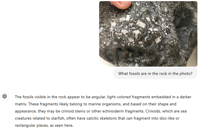 Using AI to describe fossils. I’ve been experimenting with GPT-4o to see how well it can describe fossils from smartphone photographs. At a high level it seems to perform reasonably well given most fossils found are not complete specimens.