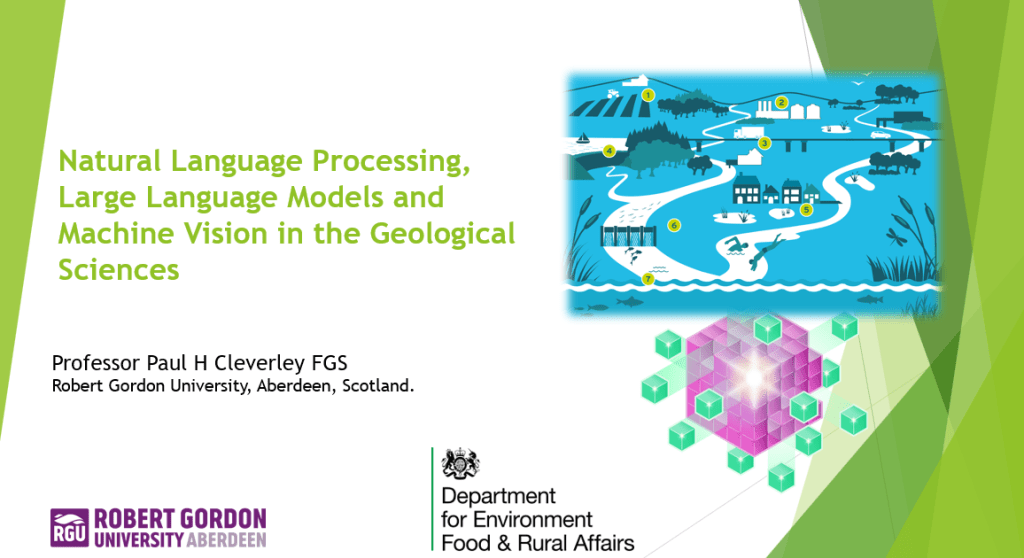 Gave a talk today on Artificial Intelligence to the UK Government Department for Environment, Food and Rural Affairs (DEFRA). A focus on Natural Language Processing, Large Language Models and Machine Vision in the Geological Sciences.