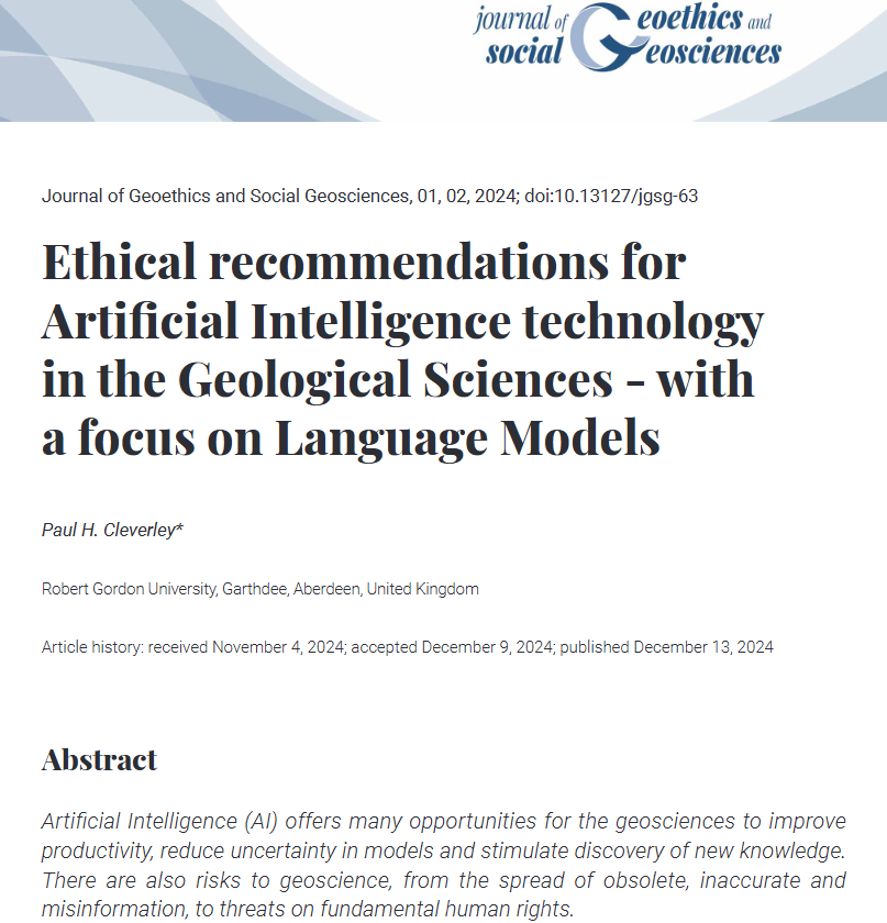 Delighted my paper on AI Ethics in the Geological Sciences has been published today in the peer reviewed open access Journal of Geoethics and Social Geosciences!