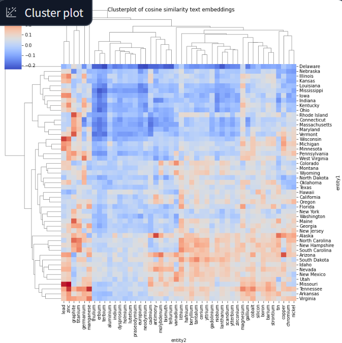 The distance of the embeddings for these entities are clustered in the heatmap so similar rows and columns are next to each other. The magnitude is shown of the text embedding (i.e. red=similar, blue=dissimilar). This provides us with a data driven view where there are similar states and minerals generated from the patterns of words in text.