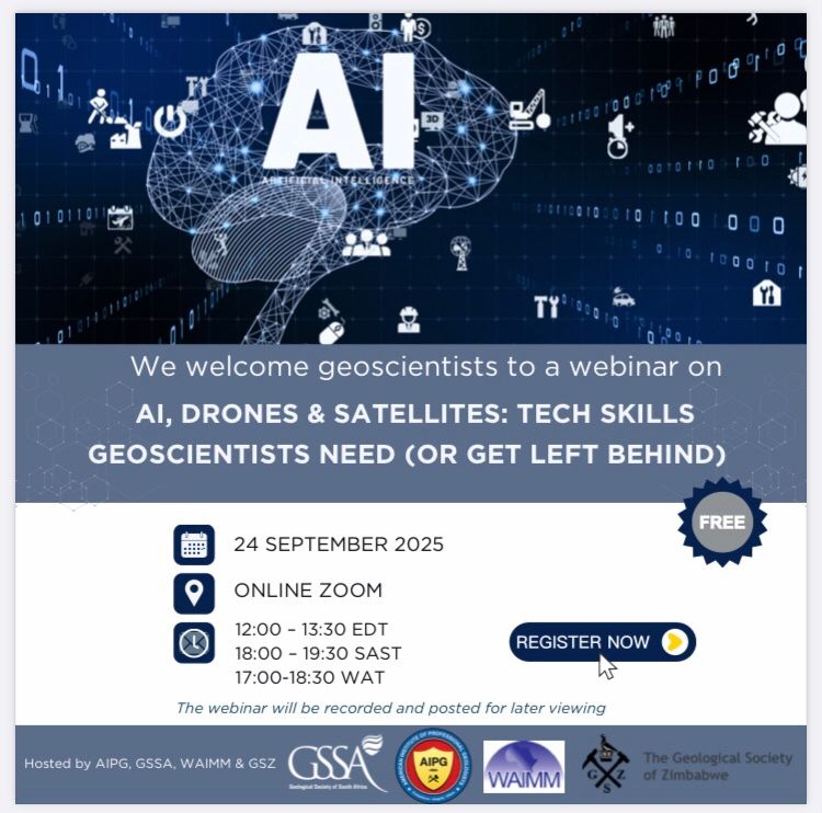 Free webinar AI, Drones and Satellites for Geoscientists: Sponsored by AIPG, Geological Society of South Africa, Zimbabwe & West African Institute of Mining, Metallurgy and Petroleum.