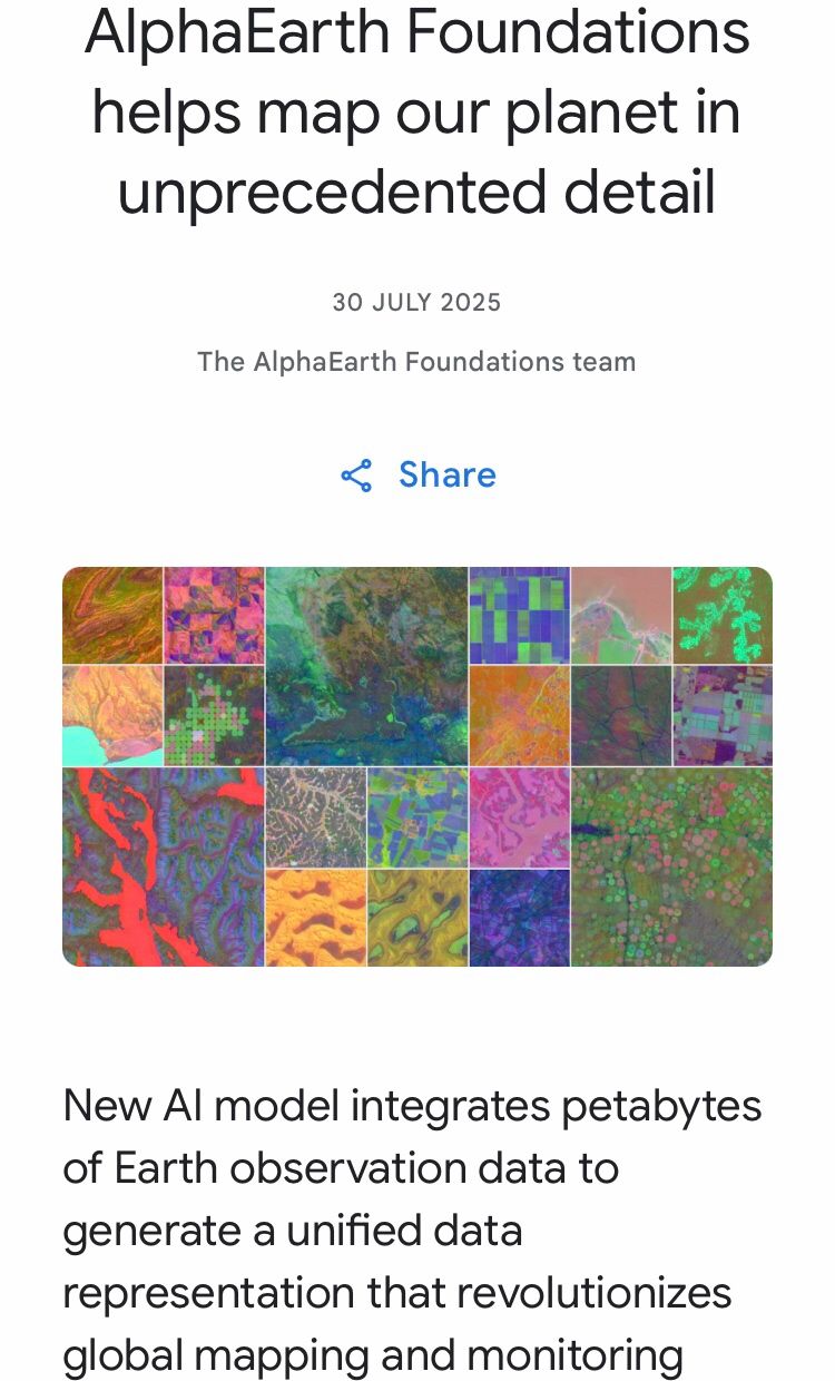 “AlphaEarth Foundations is an artificial intelligence (AI) model that functions like a virtual satellite. It accurately and efficiently characterizes the planet’s entire terrestrial land and coastal waters by integrating huge amounts of Earth observation data into a unified digital representation, or “embedding,” that computer systems can easily process. This allows the model to provide scientists with a more complete and consistent picture of our planet’s evolution, helping them make more informed decisions on critical issues like food security, deforestation, urban expansion, and water resources.